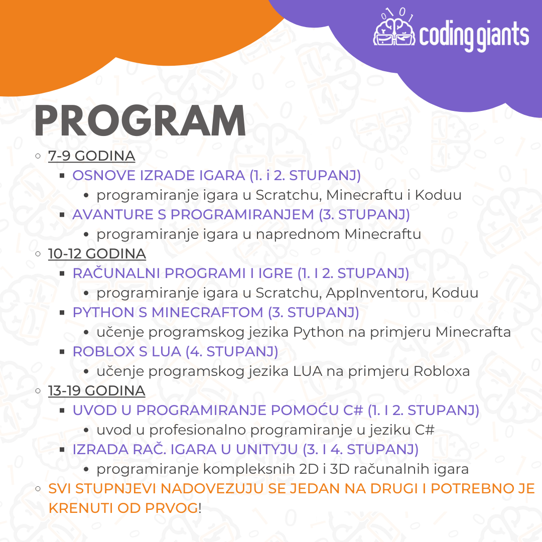 Važno je napomenuti da se s učenjem programiranja uvijek kreće od prvog stupnja. Tako dolazimo do drugog važnog faktora na koji morate paziti prilikom upisa – stupnja postojećeg znanja. Prvi stupanj naših tečajeva prilagođen je potpunim početnicima u programiranju koji su se možda susreli s nekim osnovama programiranja u okviru školskog obrazovanja ili nisu uopće. Program škole Coding Giants zamišljen je tako da se svaki stupanj tečaja programiranja nadovezuje na onaj prethodni, stoga nema preskakanja stupnjeva. Svi novi učenici upisuju 1. stupanj. Učenici koji su već bili naši polaznici u nekom od prethodnih semestara upisuju prvi sljedeći stupanj tečaja za svoj uzrast. Kad završe sve stupnjeve i promijeni im se dobna skupina, upisuju 1. stupanj tečaja za stariju dobnu skupinu.